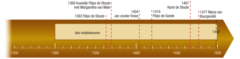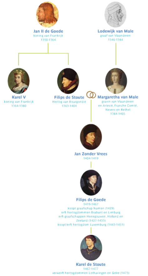In 1384 erft de Bourgondische hertog Filips de Stoute, die een Franse prins is, het graafschap Vlaanderen van zijn schoonvader, graaf Lodewijk van Male. Aanvankelijk bemoeien de Bourgondische hertogen zich vooral met de Franse politiek. Dat verandert wanneer hertog Jan zonder Vrees in 1419 vermoord wordt met medeweten van het Franse koningshuis. Zijn zoon Filips de Goede volgt hem op. Wanneer Filips in 1467 overlijdt, zijn de Nederlanden totaal veranderd.